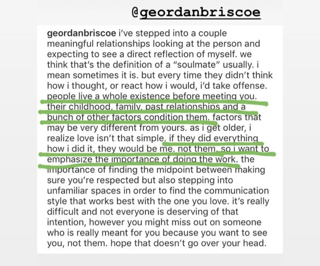Yesterday as I’m scrolling through social media trying to still make sense of Kobe’s death, life, and just personal shit we all go through, I stumbled upon Geordan’s post on relationships and how challenging it is to find someone who speaks your love language. I struggle with communication in the many relationships I’ve come across. Assumptions, expectations and not doing the work to understand before acting out or choosing not to act at all has ended many of those relationships prematurely and most likely it’s been my fault. From an “Ok” response after they’ve sent me an ECR to over expressing myself to the point I’ve become annoying. I’ve wanted to be “in love” so much that I’ve allowed chasing that “soulmate” ideology cloud my judgement and given that intention to women who didn’t want nor deserve that much of me. Im a relationship type of guy but now I’m starting to realize that’s not always what’s best for me or those I tend to attract, some women just want to have fun not build and grow with you or wait for you to grow with them. I always thought being with me must be great, I care, I show affection, I trust people, I support and build up whoever I deal with unconditionally, but I also have my drawbacks and flaws that until as of recent I haven’t really noticed but it’s posts like this that snap me back into reality. I will always be a lover, now it’s just about who gets to receive that love and can reciprocate it in a manner that satisfies us both and being able to reciprocate that energy consistently. There’s nothing like the attention from who you want it from and sharing those moments that give you butterflies and time stands still. I still want that I just have to work on myself so that I can be the best Man I can be for my “Soulmate” if I still got one out there somewhere. Thanks again Geordan I really did need to see this.