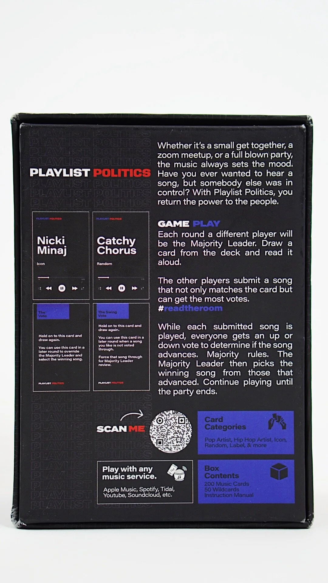 This past weekend I had the pleasure of shooting and directing a product shoot for a new Party game called Playlist Politics where you are in control of the music and the vibe. Pick a card that has either an artist, genre, or keyword that you have to write down the first song that pops in your head and then the group votes on what song is the most popular. The most popular song gets played, majority rules. Simple but fun and interactive to get you and your friends social and the vibe right for any function.