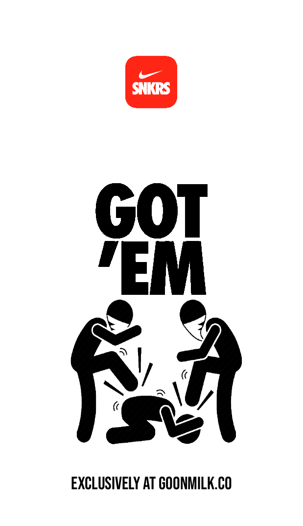 This being my first pair of Air Forces I felt the need to make them my own and in turn creating my own Air Force one, the GoonMilk GF1. Pairs will be accompanied with a Limited Edition matching Got’EM Hoodie playing off Nike’s terrible SNKRS app congratulatory shoe raffle winner banner. Shoe Drops April 8th at Midnight. If you’re reading this now and they’re sold out, sorry its too late.