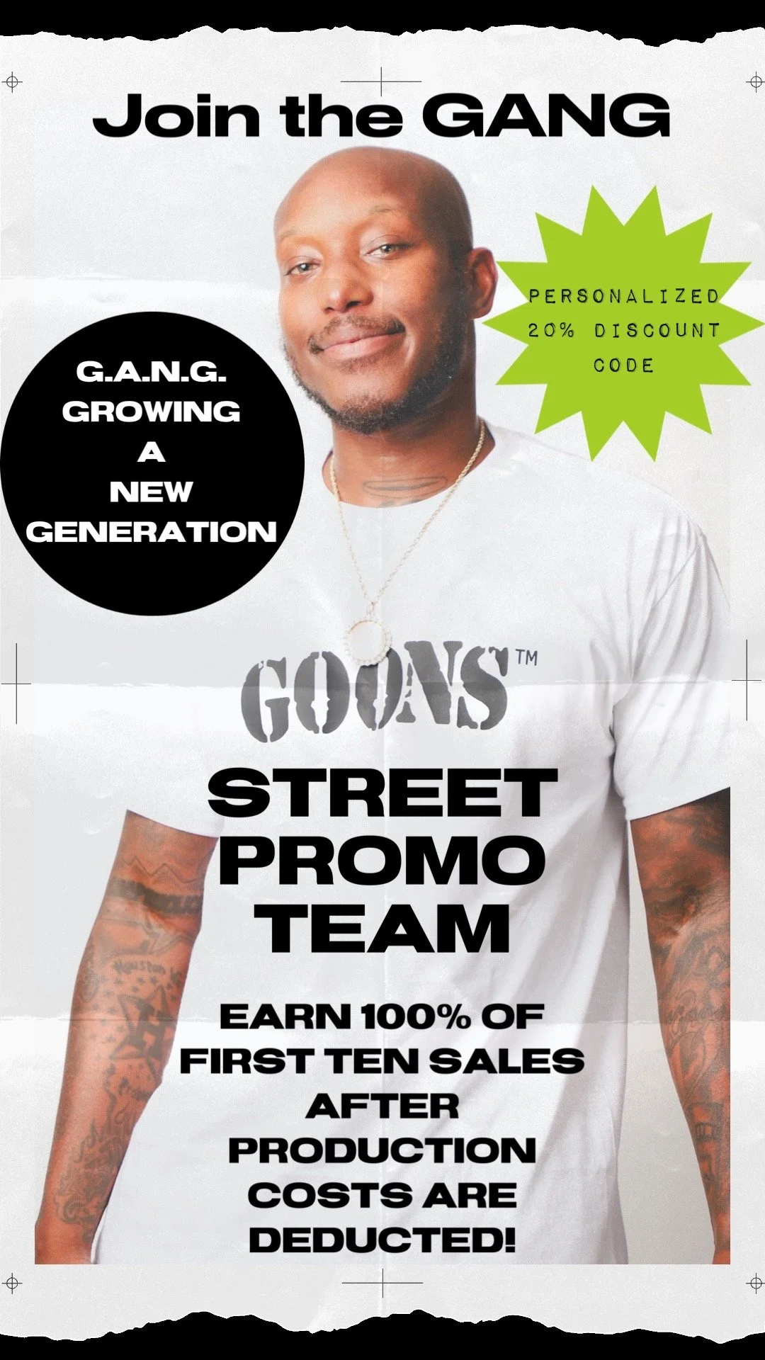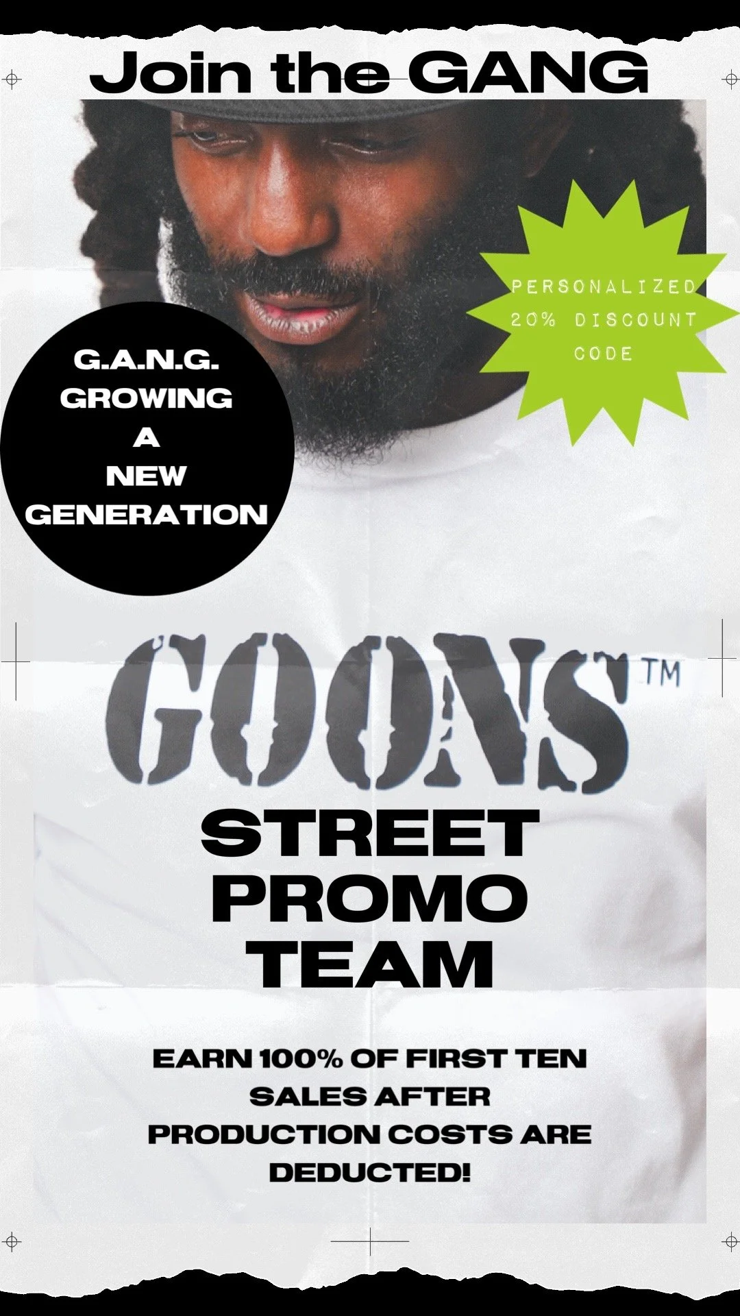 This is your chance to be apart of Growing A New Generation(G.A.N.G.)! Your participation and working with me helps G.O.O.N.S. by providing the platform and also spreading the knowledge of ten years experience in the industry to hopefully fuel the next generation into pursuing their own entrepreneurial endeavors.
